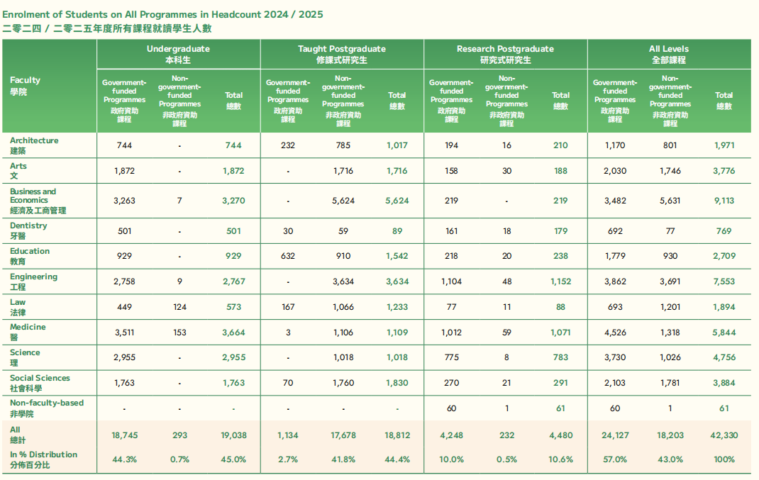 2024/25学年,香港大学在校学生总数比上一学年的39,166人新增了3,164人,为42,330人,其中本科生为19,038人,其余均为研究生阶段学生。规模持续扩大,彰显其优质教育对全球学子的吸引力。