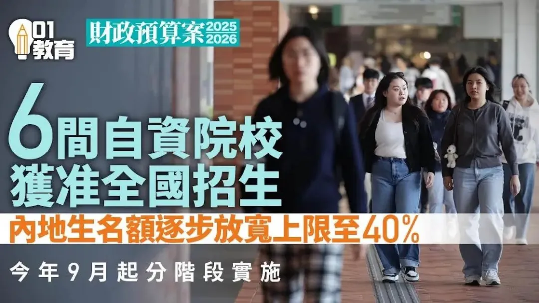 而且,香港教育局宣布,已取得国家教育部同意,逐步放宽六所自资院校的内地学生限额,以及批准有关院校面向全国所有省份招生。