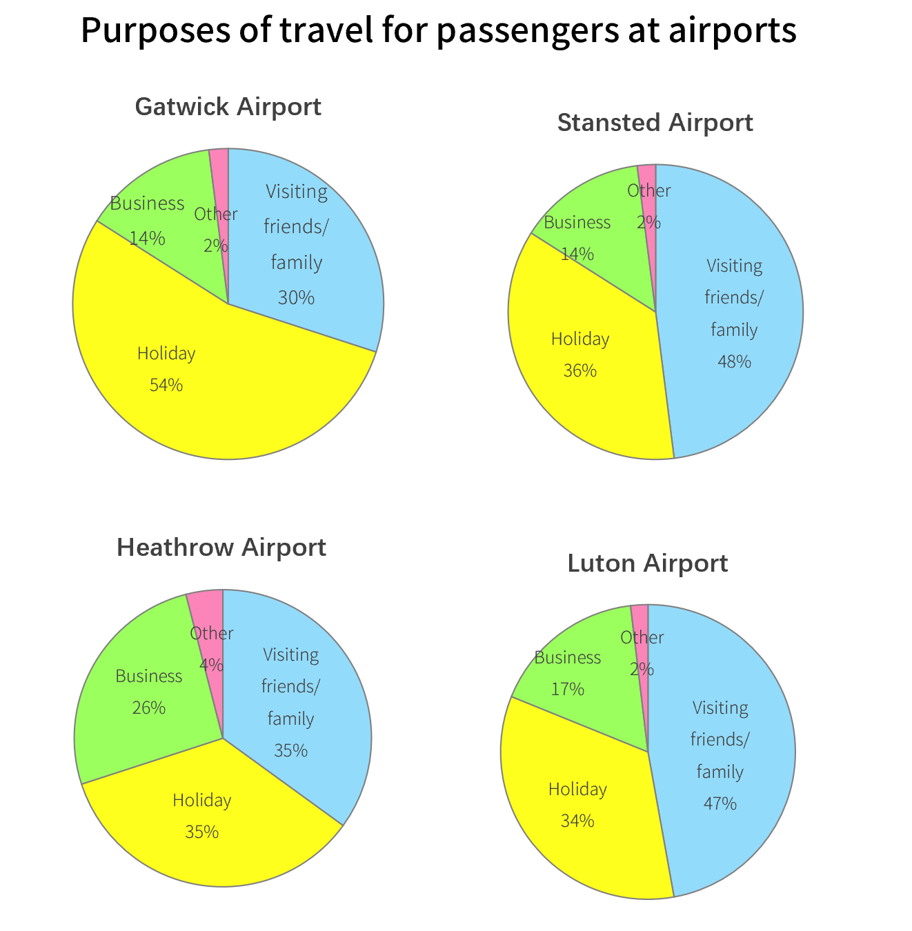 The charts below give information about the purposes of travel for passengers using four different UK airports in 2016.