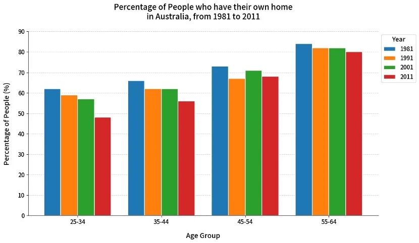 今天的小作文考的是动态图,澳大利亚不同年龄段住房自有率在1981年到2011年之间的变化。这张图能看出来所有的年龄段的住房自有率都呈下降趋势,年轻群体降幅最明显,所以建议可以25-34年龄段的住房自有率变化写一段,35岁以上的住房自有率变化写一段。总结可以写1981年至2011年之间,年轻人和中年以及老年群体之间的住房自有率差距在增大。