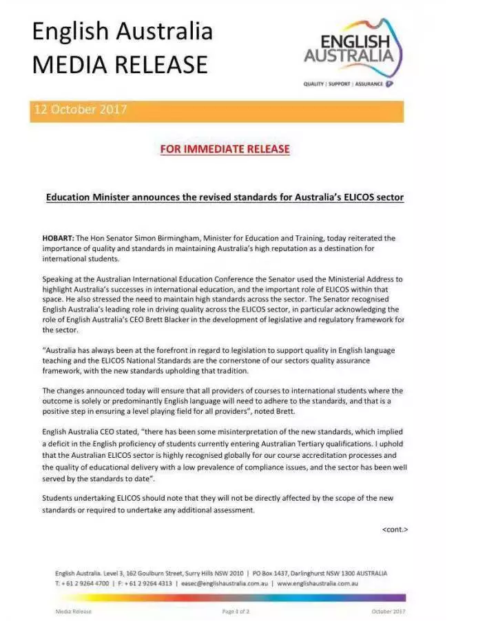 随后来自ELICOS的主管机构English Australia放出的官方澄清文件也表示:新规并不会直接影响并且增加额外的考试。