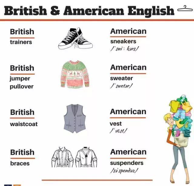 我们还在上学时,最早接触的英式美式英语的区别应该是soccer和football,或者holiday / vacation, biscuit / cookie,Autumn / Fall 这类的。其实在日常中看到的所有东西都可以去查一查他们的不同说法,毕竟出国后会遇到来自各个地方的小伙伴,你一直以为毛衣是sweater,别人一说jumper,可能你还以为是那种套在衬衫外面的无袖裙子。