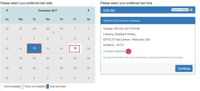 流程四:选择好考试时间后,点击继续(Continue), 就可以自行选择口语的具体考试时间啦~