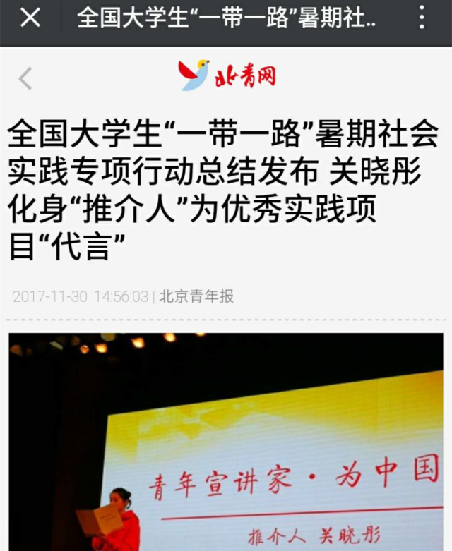 北京电影学院2016级表演系学生、“90后心中的十九大”讲述人之一关晓彤,作为“青年宣讲家,为中国代言”的推介人,推介了四支在“一带一路”上看中国发展、讲中国故事的大学生实践团队。东华大学研究国内行业发展,中南财经政法大学调研国内“一带一路”特殊经济区的发展,中国民航大学查勘道路、航空、航海、铁路、信息网络的联通现状,吉林农业大学则致力于对外宣讲中国形象。以他们为代表的全国100余支团队走访大江南北、各行各业,用脚步丈量中国的发展,用行动为中国代言。