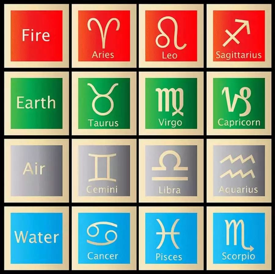 星座可以分为四象(four elements):水象(water)、土象(earth)、风向(wind/air)、火象(fire)。