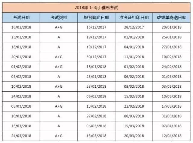 2018年4月至12月雅思考试报名截止日期、准考证打印日期和成绩单寄送日期: