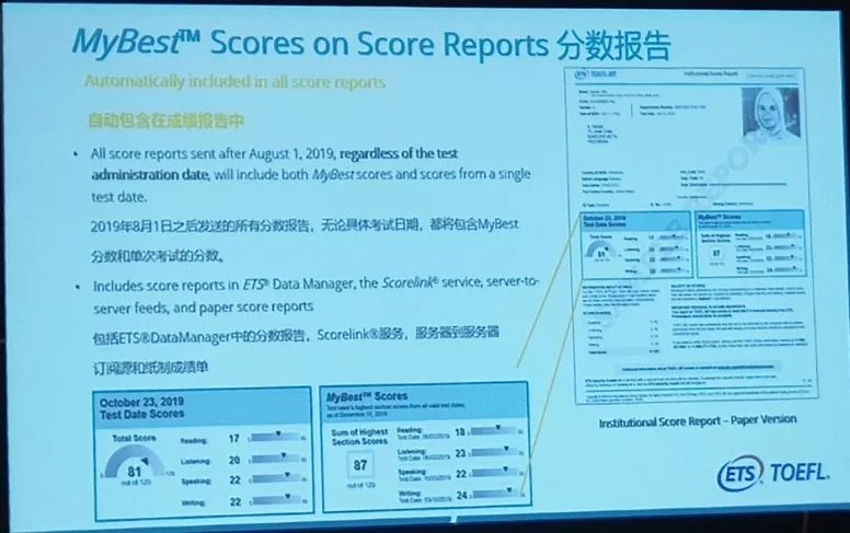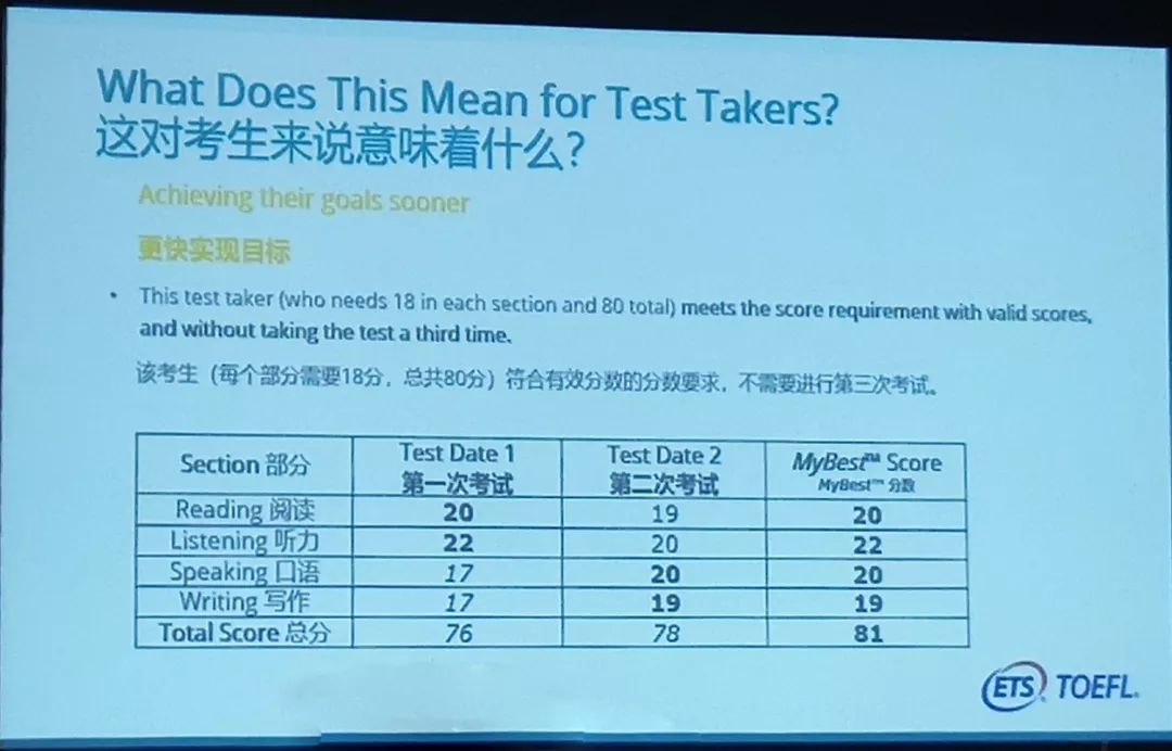 自2019年8月1日起,托福将推出 MyBest Scores(个人成绩)政策,也叫superscores(超级成绩), MyBest Scores可以体现考生的实力。