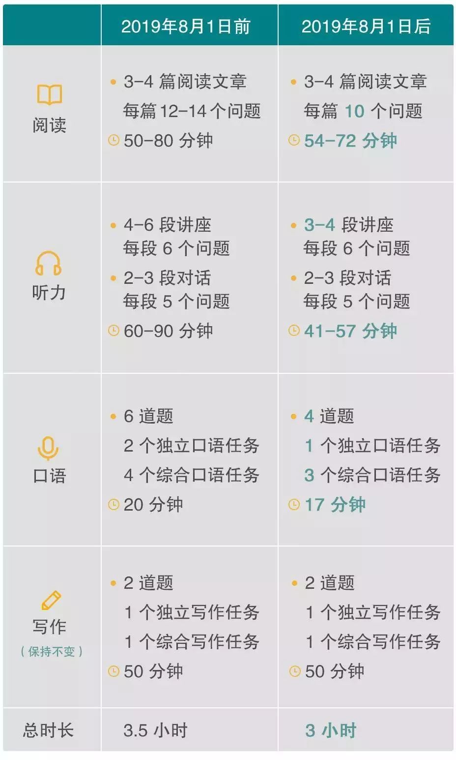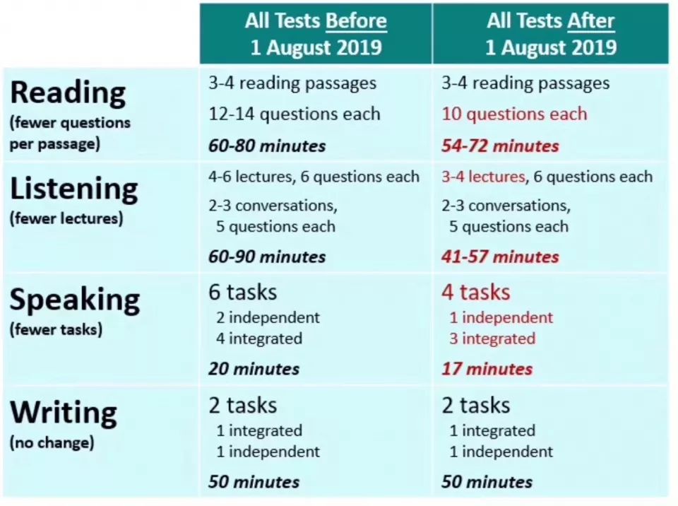 自2019年8月1日起,托福测试时间将缩短至3个小时,减少30分钟。考试时长缩短后,整体考试形式、题型和评分标准保持不变,阅读、听力、口语部分问题数量变少,但分数量表没有变化。