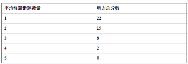 我们知道,托福听力一套题两个 section 共六篇材料,每篇 5道或 6 道题。那么,每篇错题数量与总分的关系如下表: