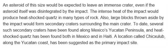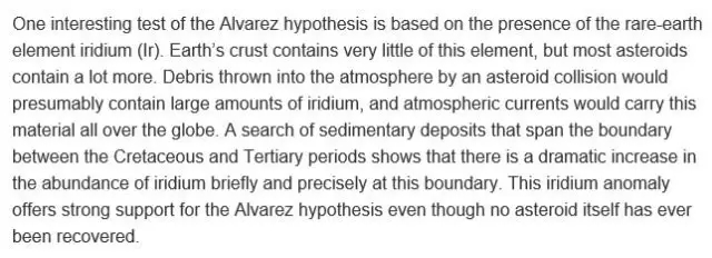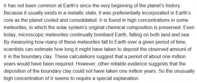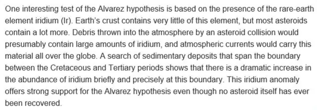 6、K-T boundary当中的铱的含量,据计算,如果是小陨石(当今地球接收的常规体量的陨石) 带来的话,那得要一亿年才积累得了~不过,没有展开细说的其他证据表明,积累的时间并没有花上一亿年。