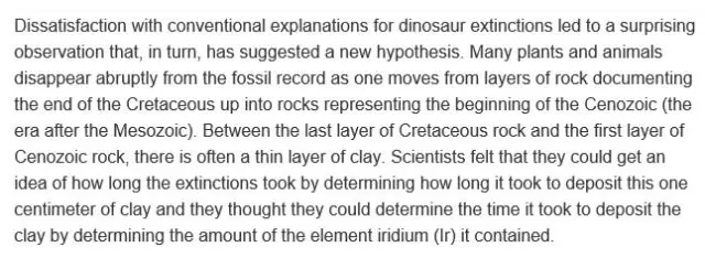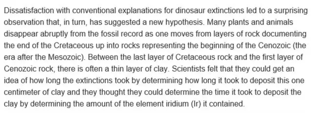 Many plants and animals disappear abruptly from the fossil record as one moves from layers of rock documenting the end of the Cretaceous up into rocks representing the beginning of the Cenozoic (the era after the Mesozoic). Between the last layer of Cretaceous rock and the first layer of Cenozoic rock, there is often a thin layer of clay.(TPO8B)