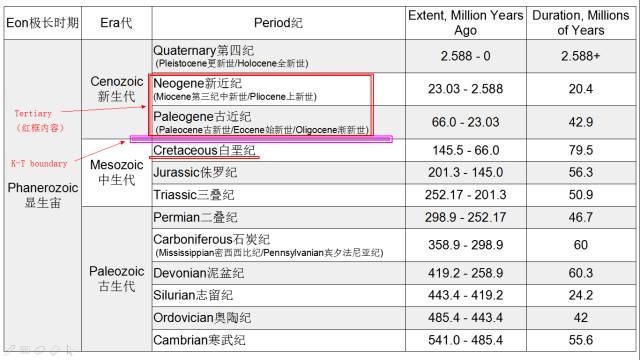 第三纪(Tertiary)包括了新生代的古近纪(Paleogen)和新近纪(Neogene),看下表。