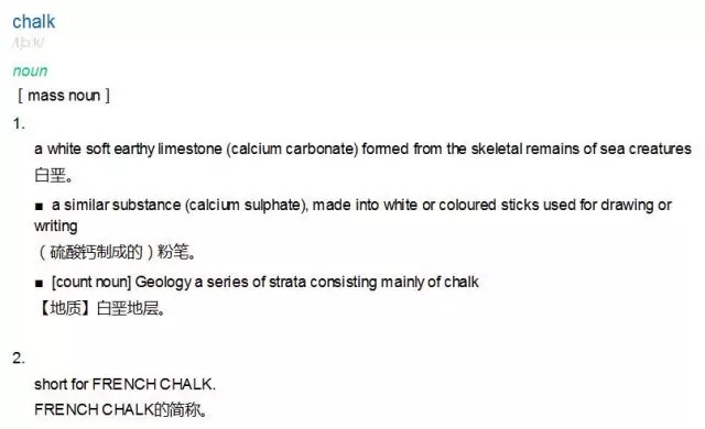 “白垩”就是 chalk(白色柔软泥土似的石灰岩,由古老海洋生物的骨骼残骸形成,成分是碳酸钙 calcium carbonate),chalk 另外一个意思大家会比较熟悉——粉笔(不过粉笔的成分是硫酸钙 calcium sulphate)。