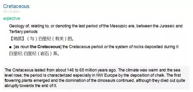 拉丁文中 creta 表示 chalk,所以 Cretaceous 即“白垩纪”。