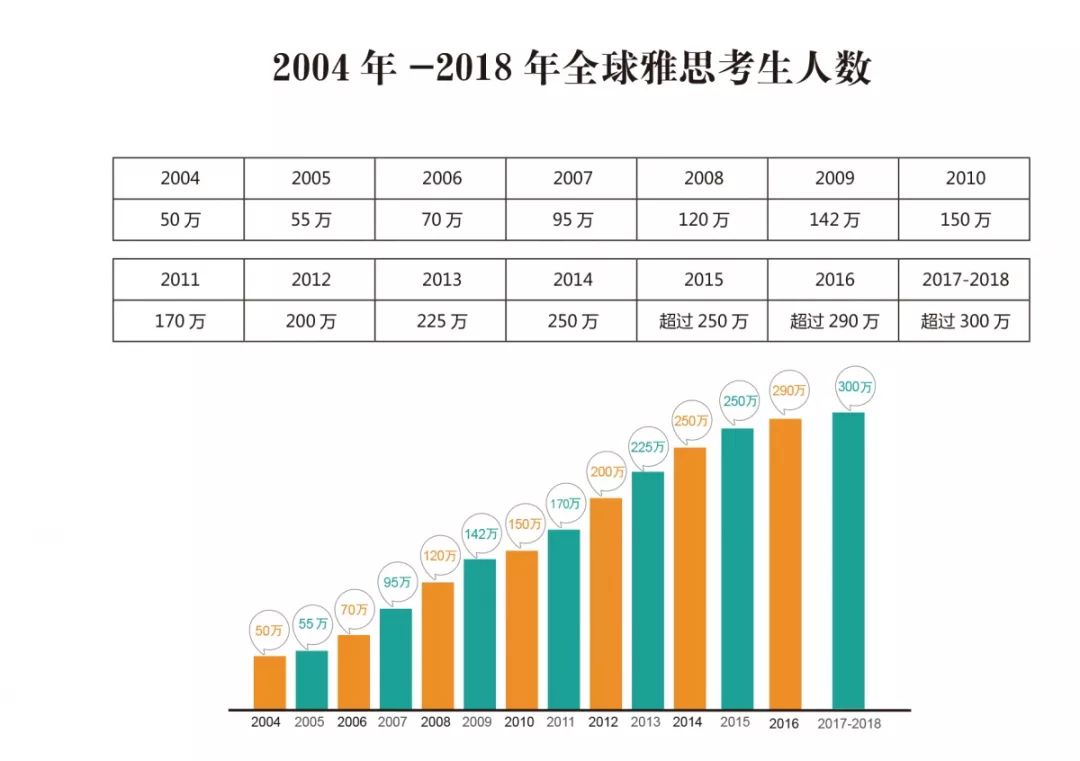 英国文化教育协会(雅思考试主办方)在2017年9月宣布全球雅思考生数量突破300万人次,在过去的2018年人数依然保持稳步增长,雅思在全球高等教育和移民申请中的重要作用十分突显。