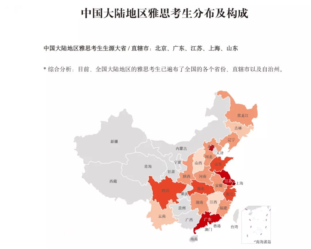 中国大陆雅思考生都主要分布在哪些地区呢?从下图可以看出,北上广不仅仅是人口大省,也是妥妥的烤鸭大省呀!