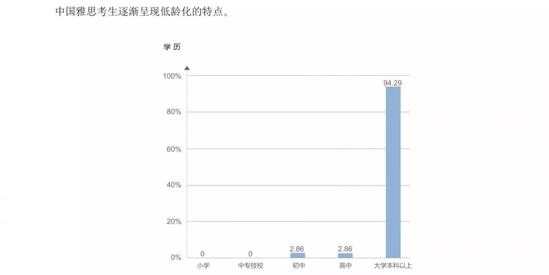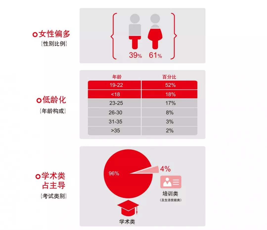 中国大陆地区雅思考生所呈现的特点有,女性偏多、低龄化、学术考试为主等,如下图所示。