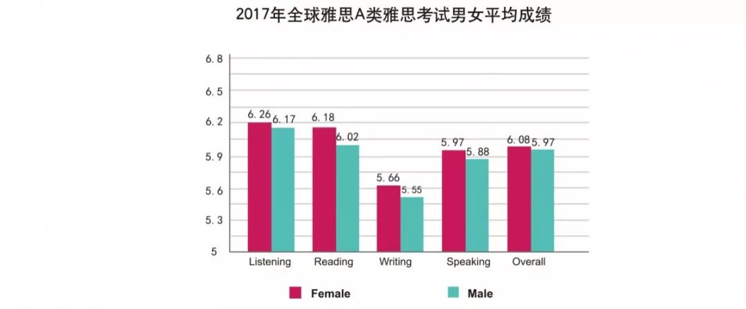 2017 年全球雅思A 类考试女性考生和男性考生的平均成绩分别为6.08 分和5.97 分。相较于2016年(女性考生平均成绩:6.0,男性考生平均成绩:5.9 分),A 类考试女性考生的平均成绩提高了0.08分,男性考生的平均成绩提高了0.07 分。