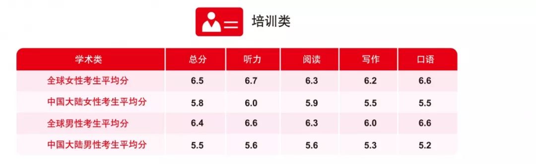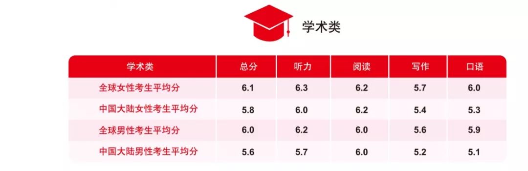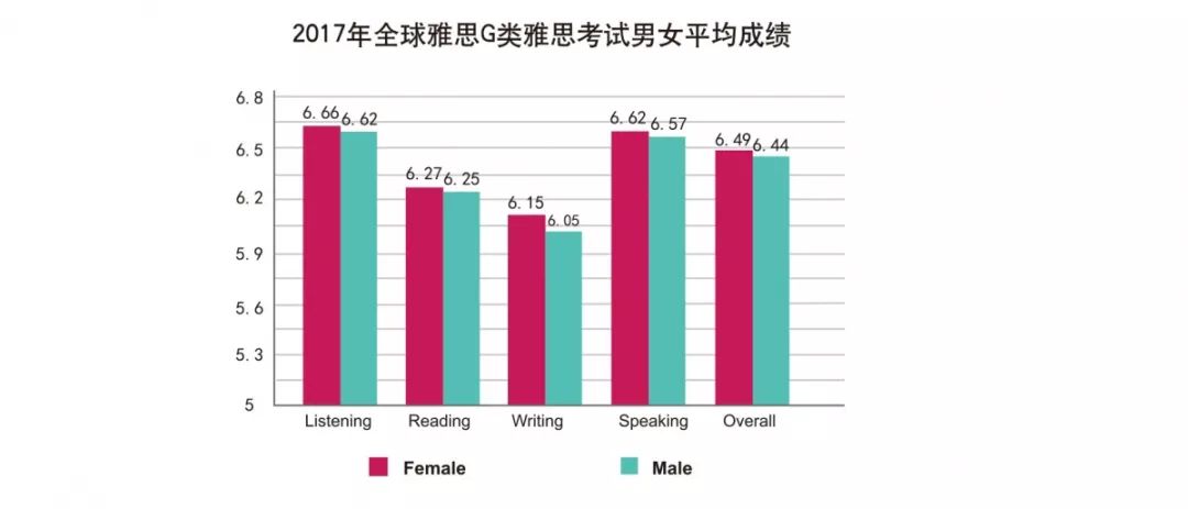 其中,女性考生平均分低于全球女性考生总分平均分0.3 分,男性考生平均分低于全球男性考生总分平均分0.4 分。除雅思阅读外,而其余三项能力与全球平均水平有一定差距。