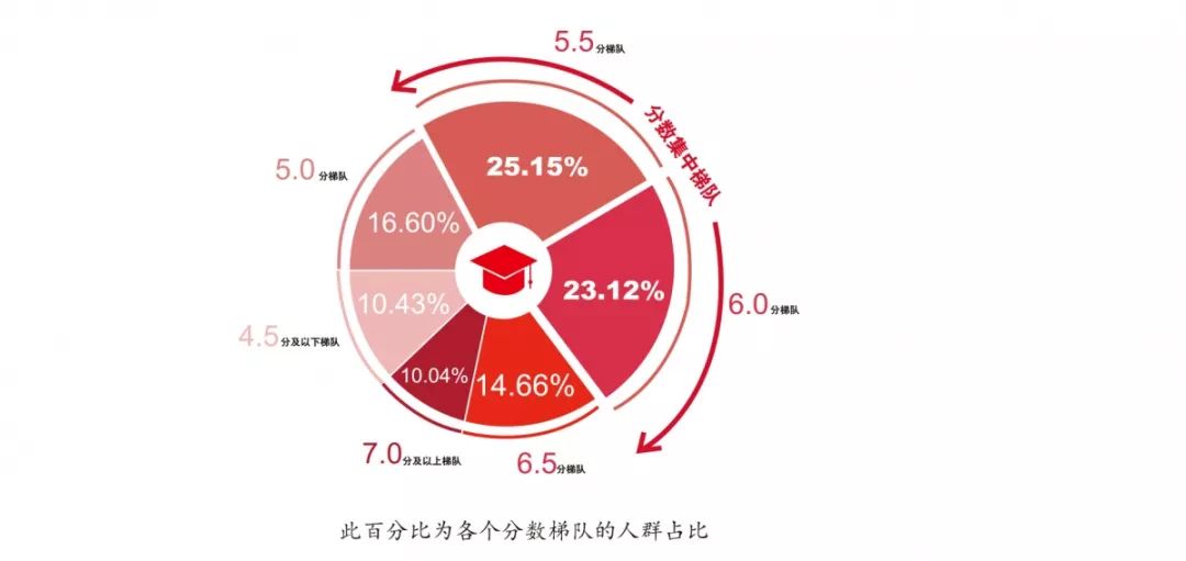 中国大陆地区雅思考生总分平均分集中在5.5 分和6.0 分两个梯队,6.0 分及以上梯队的考生接近半数。
