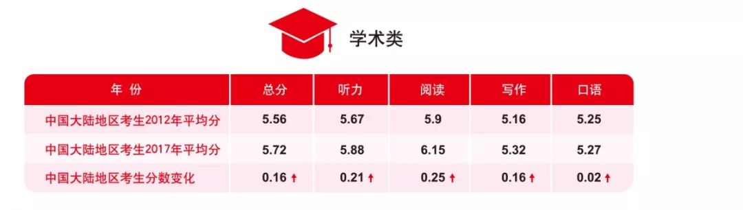 中国大陆地区学术类雅思考生2012-2017 年间学术表现小幅度提升。其中,听力及写作平均分各提升了一个分数梯队。阅读平均分虽仍然保持在6.0 分梯队,但进步幅度,此外,口语平均分也有小幅度提升。