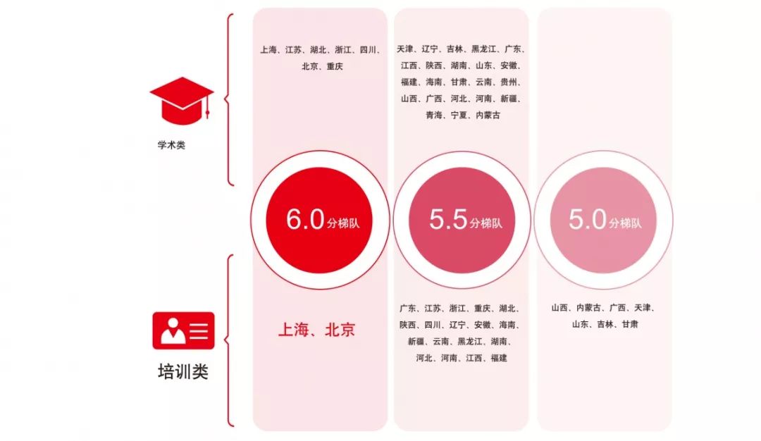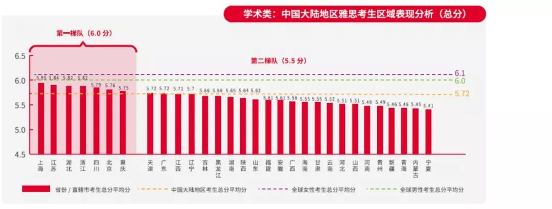 中国大陆地区各省份/ 直辖市雅思考生分数梯队分布不同,从下图可以看出,上海、江苏、湖北、浙江、四川、北京以及重庆地区的学术类雅思考生总分平均分处于6.0 分梯队;其余各省、直辖市和自治州的学术类雅思考生总分平均分均处于5.5 分梯队。